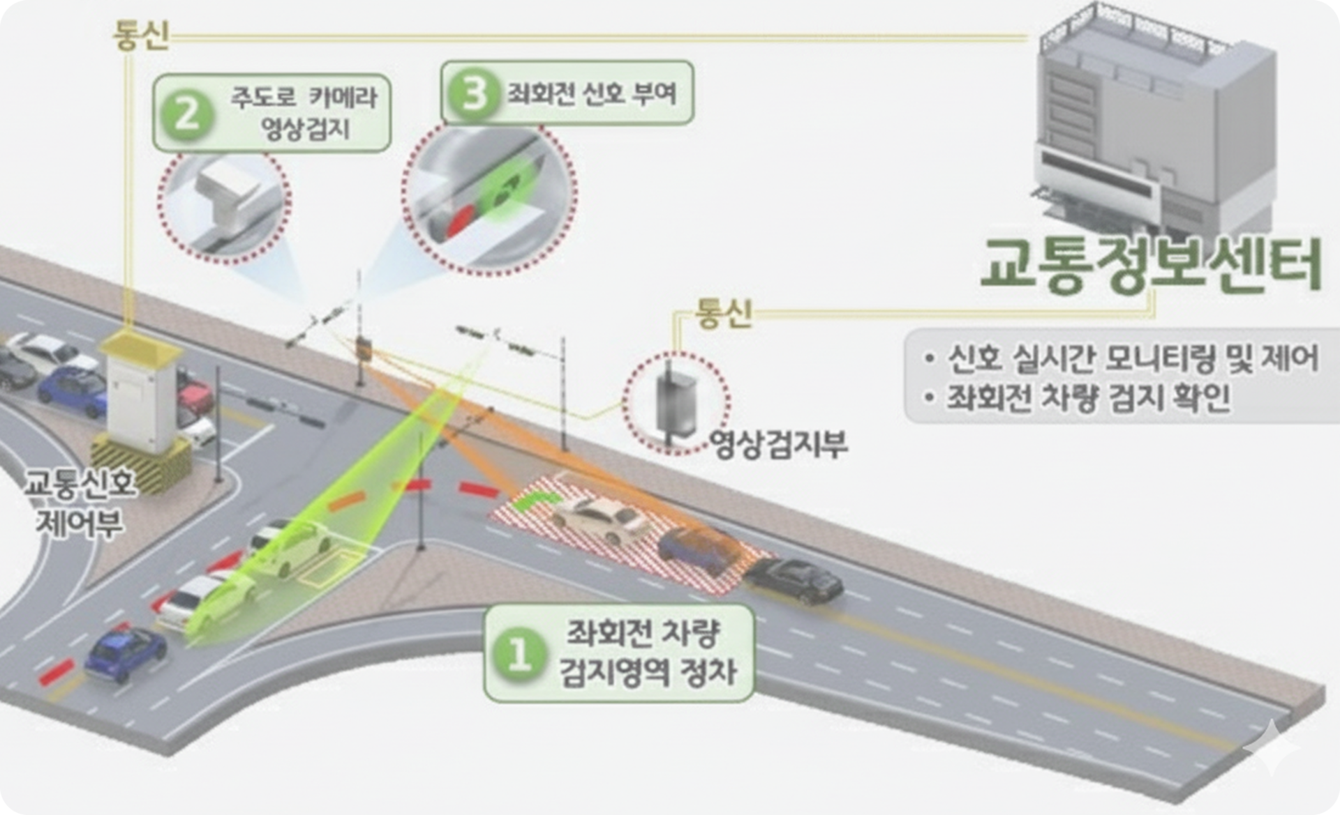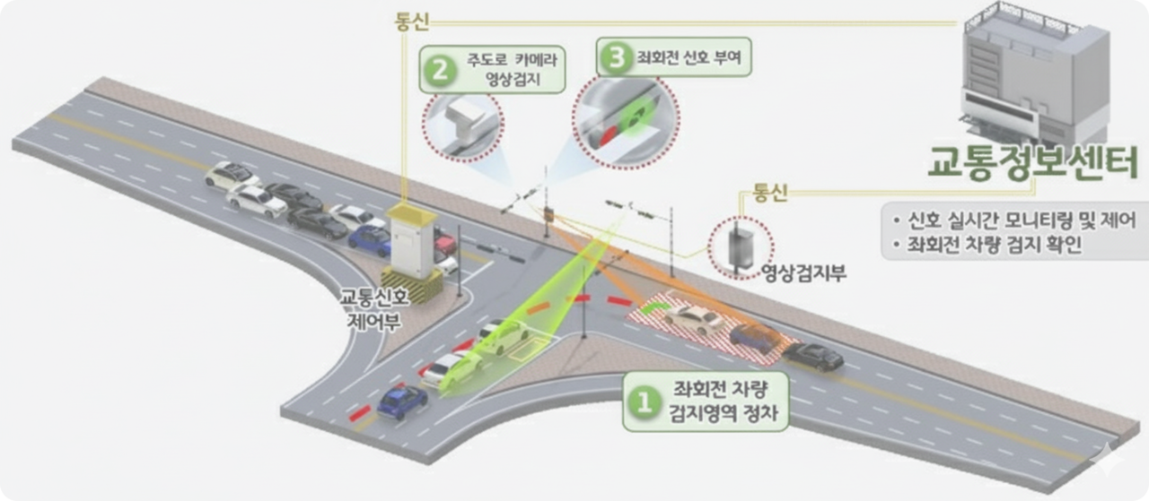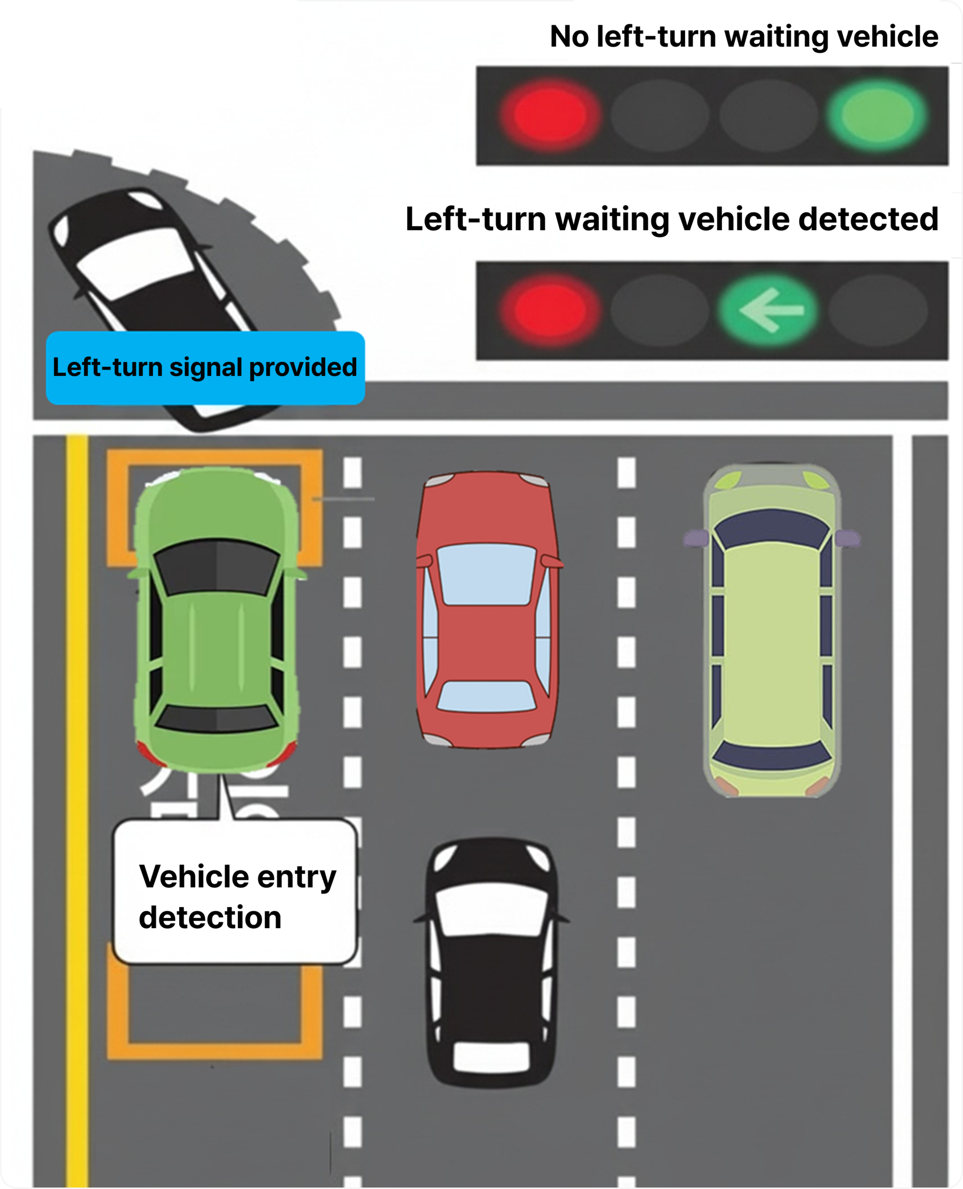 Operation of video analysis server within the center Detection of left-turning vehicles entering the ROI Optimized signal granting prioritizing main road traffic conditions |